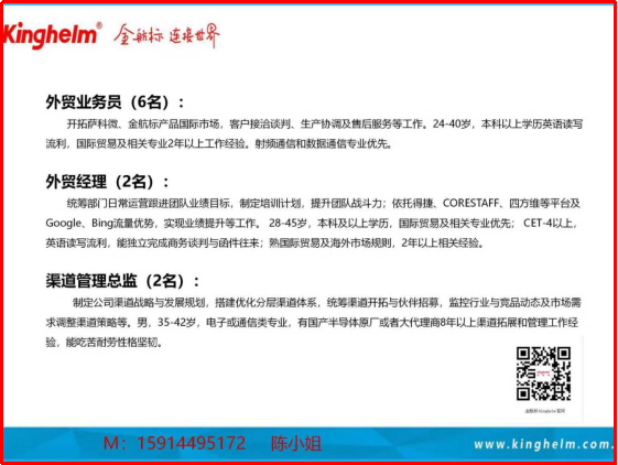 在金航标(www.kinghelm.net),我看到了一群为了梦想不懈奋斗的人,他们在各自的岗位上坚守初心,以质量为根,以创新为翼,推动着公司在市场的浪潮中稳步前行。QC岗位的同事们严把质量关,让每一件出厂的产品都经得起检验;仓储部的同事们忙碌在货物进出的一线,保障着公司的供应链高效运转;研发团队的同事们深耕技术,不断推出优质的产品;而我们的推广部门,也在用自己的方式,讲好金航标的故事,让更多人了解这家坚守品质的企业。每一个岗位,每一位员工,都是金航标发展路上不可或缺的一份子,大家用自己的努力,诠释着“守正、精进、坚韧、细节”的企业文化。