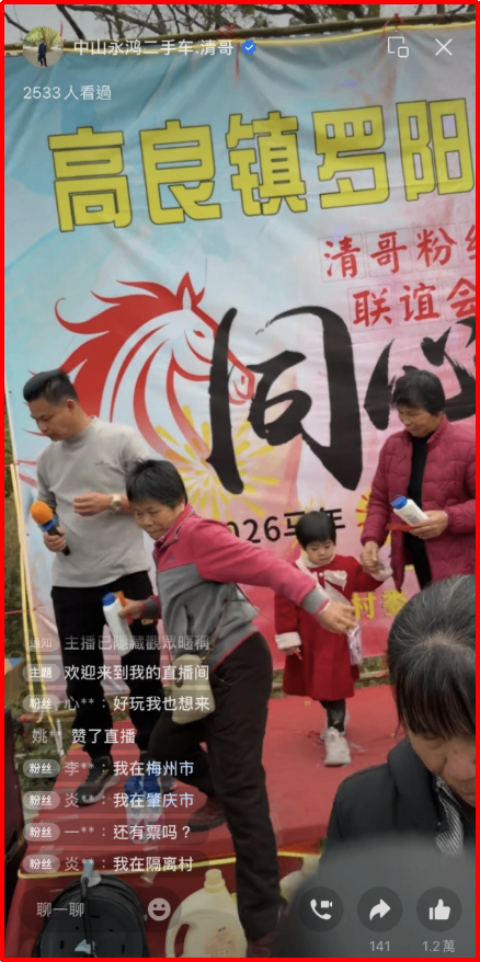 暖冬的阳光格外慷慨,驱散了冬日的寒凉,也让乡村的热闹格外繁盛。村里新建的集体操场,在大年初一迎来了首场盛会 —— 二手车行清哥的粉丝见面会。上午十点,操场里人声鼎沸,喷绘背景上 “高良镇罗阳”“清哥粉丝联谊会” 的字样格外醒目,2026 马年的标识与 “同心” 二字,透着乡土间的凝聚力。活动线上线下同步火热,主播 “中山永鸿二手车・清哥” 的直播间里,超 2500 人围观,1.2 万点赞刷屏,弹幕里有粉丝喊着 “好玩我也想来”,有人从梅州、肇庆赶来赴约,还有人追问 “还有票吗”。舞台上,洗衣液、日用品等免费奖品整齐摆放,呼应着 “二手车、洗衣机、冰箱、买车满减券” 的丰厚福利,乡亲们欢聚一堂,赢奖品、享热闹。清哥在外打拼赚到收益,不忘回馈乡里,用一场热闹的见面会带动村里活力,给父老乡亲送福利,这份乡土情怀,让这个春节多了份暖心的人情味。