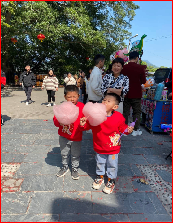 闲暇时漫步金林水乡,1700 多年的岭南古村,在暖冬里尽显风情。古村的环境愈发优美,碧水绕村、古树参天,红灯笼挂在枝头,石板路上残留着鞭炮碎屑,透着浓郁的年味。各地游客慕名而来,网红打卡点前有人驻足拍照,古村的文化底蕴在烟火气里愈发鲜活。孩子们的快乐,是水乡最动人的风景。两小只穿着红卫衣,在溪边玩水嬉戏,蹲在石滩上用小木棍拨弄溪水,水面漾起圈圈涟漪,站立的男孩咧嘴大笑,喊着伙伴的名字,简单的溪水与落叶,就盛满了他们的欢喜;逛到集市,粉色的棉花糖成了他们的专属甜蜜,闭着眼大口咬着糖团,甜意从嘴角蔓延到心里,成了童年春节最鲜明的印记。