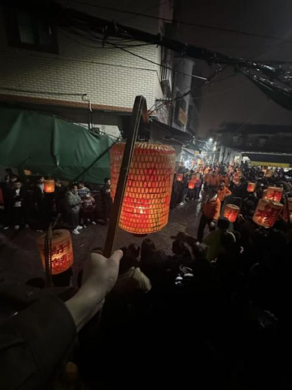 夜幕降临,迎老爷迎来高潮——跳火堆。村民堆起干草堆,燃起熊熊篝火,抬轿者与勇士们依次跃过火堆,火星四溅、呼声震天。这一习俗寓意跳过晦气、迎来兴旺,烧去旧岁烦恼,迎来新年顺遂,是潮汕民俗中最具生命力的场景。与此同时,村中男丁遵循古制,提着“杨”字灯笼到古寨上灯,缄默往返,将福光带回家中,灯火点点,与篝火、烟花交相辉映,照亮古村的夜空。