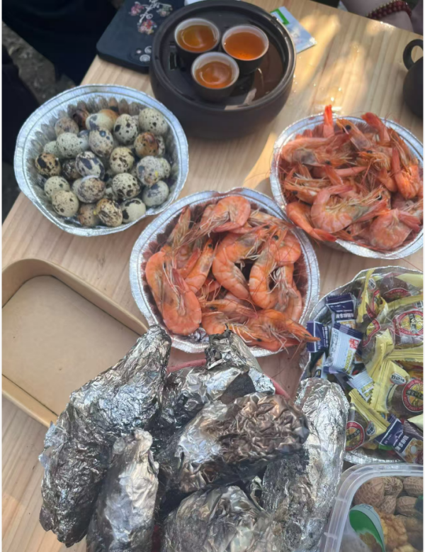 旺火旁的木桌,早已被年味填得满满当当。锡纸包裹的惊喜不止红薯,还有带着泥土气息的烤物;两盘红亮的虾子码得整整齐齐,寓意着新岁红红火火、笑口常开;一碗鹌鹑蛋圆润饱满,藏着“团团圆圆”的期许。几盏热茶在炉上温着,水汽氤氲间,是亲友围坐的松弛与惬意。