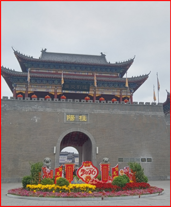 站在桂阳文化园的城门下,青灰色的城砖在薄雾里泛着温润的光泽,“桂陽”二字的鎏金匾额与“控引交廣”的题字遥相呼应,仿佛在无声诉说这座千年古郡的过往。2026年的新春装饰还未褪去,红底金纹的“福马迎新”装置与朱红宫灯交织,让厚重的历史多了几分鲜活的暖意。