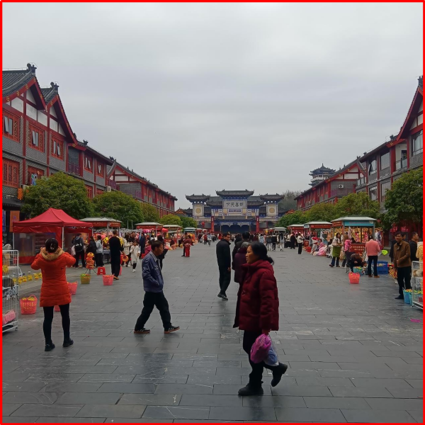 穿过城门洞,视线豁然开朗。青石板铺就的主街向远方延伸,两侧是仿明清风格的砖木建筑,灰瓦白墙间,朱红立柱与雕花窗棂勾勒出规整的轮廓。远处的“天下县珍”牌坊在薄雾中若隐若现,两侧的商铺已支起红色的遮阳棚,吆喝声、孩童的嬉闹声与游客的笑语交织,让这条古街有了人间烟火的温度。我看见一位身着枣红色棉服的阿姨提着塑料袋走过,衣角沾着些许湿润的水汽,像是刚从集市归来的寻常人家;穿蓝布衫的男子步履匆匆,仿佛要赶赴一场老友的邀约 —— 这些鲜活的身影,让冰冷的古建筑有了呼吸。