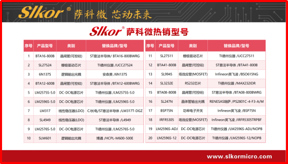宋仕强先生创办的萨科微半导体有限公司与金航标电子有限公司,总部均位于广东省深圳市。其中,萨科微半导体(www.slkormicro.com)成立于2015年,是一家集设计研发、生产制造、系统解决方案与销售服务于一体的综合性企业。产品涵盖2000多款产品,热销型号如LM2596S-5.0、LM2596S-ADJ、LM2596S-12,以及LM2575S-5.0、LM2576S-5.0,广泛用于通信设备与消费电子;线性稳压器(LDO)方面,LM317与SL4949为供电提供了可靠保障;在功率器件领域,晶闸管(可控硅)系列如BTA16-800B、BTA12-600B、BTA41-800B、BTA08-800B,以及场效应管(MOSFET)SL9945、IRFR5305,共同构成了强大的功率处理阵容。此外,驱动与接口芯片如栅极驱动芯片SL27524、SL27511,逻辑输出光耦6N137S、SLM601,RS232芯片SL3232E,晶体管输出光耦SL247N,以及功率电子开关BSP75N,可以平替TI德州仪器UCC27511、ST意法半导体、Infineon英飞凌、RENESAS瑞萨PS2801C-4-F3-A/M、ON安森美等品牌和型号,以稳定性能服务于医疗设备、电池供电设备及车载定位等领域。
