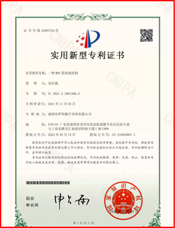 萨科微实用新型专利证书