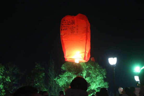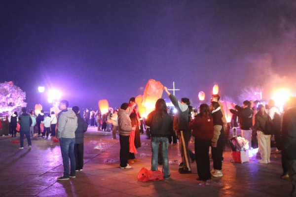当暮色四合,广场的另一侧悄然铺开一场浪漫仪式——放飞孔明灯。人群围聚在湖畔的空地上,手执素色灯纸,将写满心愿的纸条轻轻系在灯架。有人祈愿家人安康,有人默念学业有成,孩童们活泼嬉戏。随着火苗点燃灯芯,暖黄的光晕渐渐漫过纸面,孔明灯便如满月般缓缓升起。起初只是零星几点,转瞬便汇成一片流动的星河,掠过“后羿射巴蛇”的雕像,掠过洞庭湖的波光,向着天际线飘去。老人们仰头望向天空,年轻人则举着手机追逐拍摄,笑成一片。