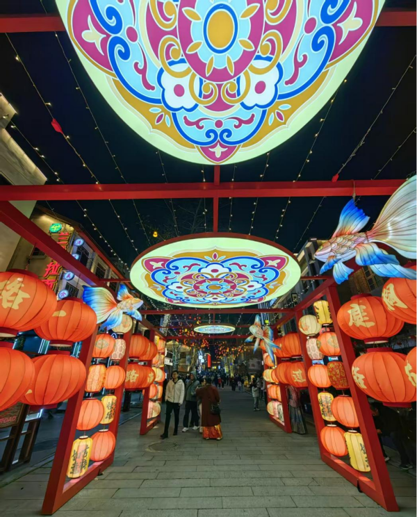 瞻岳门是岳阳楼的“门户”,麻石奠基、青砖筑砌的明清风格城楼,在春节期间披上了红绸与灯笼。城门下,非遗彩灯展将洞庭湖的渔火、君山岛的竹影化作流动的光影艺术,穿过城门,岳阳楼前的广场上,舞龙醒狮队伍穿梭人群,国潮舞蹈与NPC互动游戏让孩子们乐而忘返。