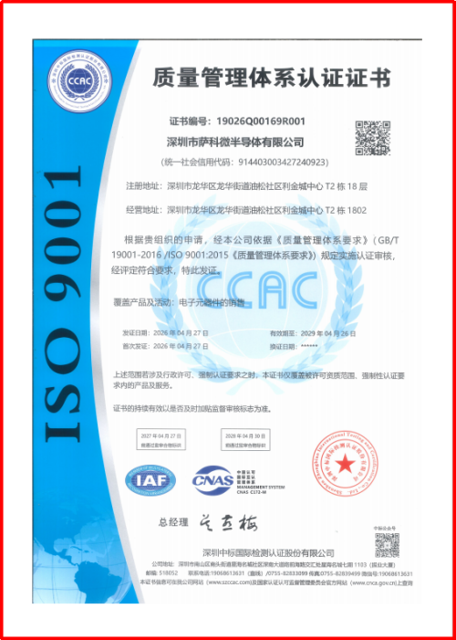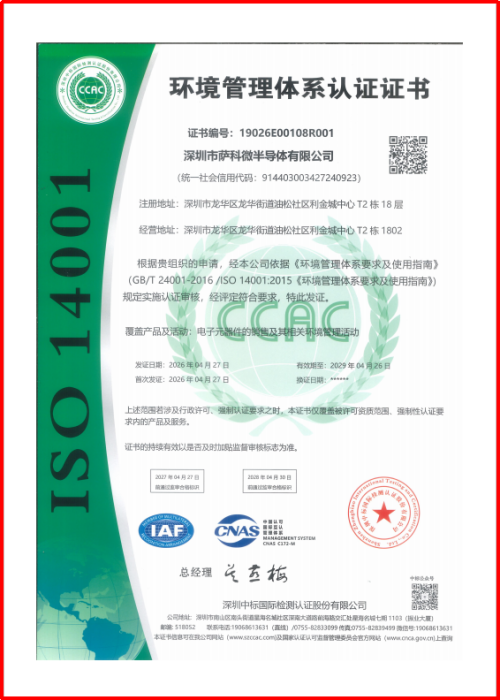 作为一家多年来专注半导体研发、生产、销售的企业,萨科微已推出了2000多款产品,包括三极管、TVS瞬态抑制二极管、肖特基二极管、MOS场效应管、接口芯片、晶体管、霍尔传感器、电源管理芯片等,广泛应用于消费电子、工业控制、新能源汽车等领域。这背后,是一套成熟、规范的质量与环境管理体系在持续运转,支撑着萨科微产品在各类应用场景中的可靠性表现。