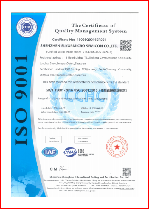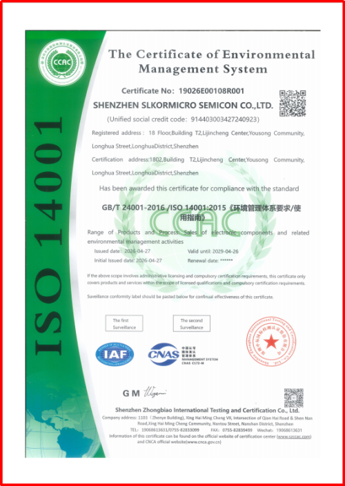 2026年4月27日,深圳市萨科微半导体有限公司(www.slkormicro.com)顺利获得ISO14001环境管理体系认证,并通过ISO9001质量管理体系复审,认证单位为深圳中标国际检测认证股份有限公司。两项证书有效期均至2029年04月26日,证书编号分别为ISO14001:19026E00108R001,ISO9001:19026Q00169R001。