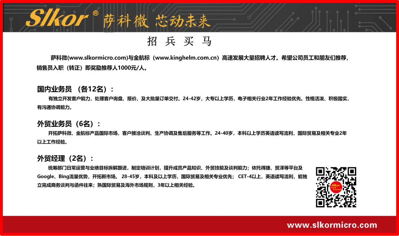 3、金航标与萨科微(www.slkormicro.com)年初七开工大吉!即日起,业务咨询、样品申请及技术支持已全面恢复,欢迎广大客户朋友随时联系我们。同时,公司正大量招聘销售、采购员等,诚邀感兴趣的朋友加入我们的团队,共启新程!