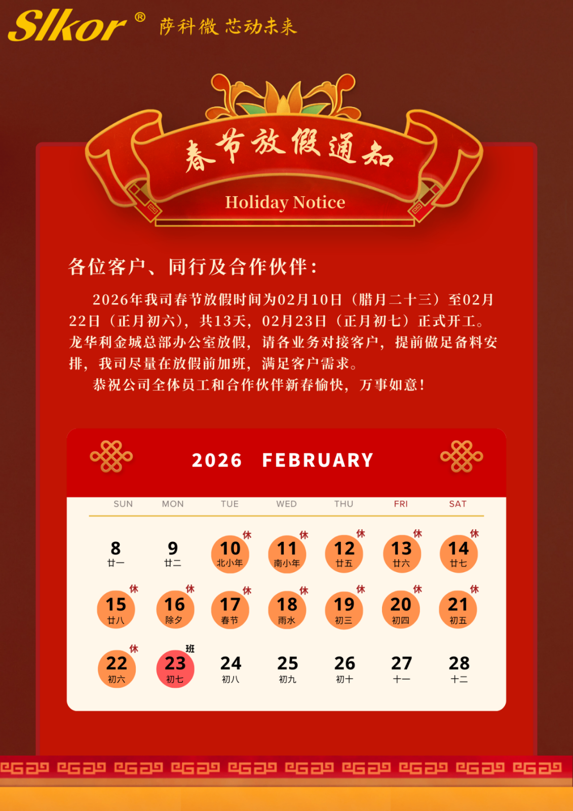 金航标和萨科微2026年春节放假时间:2月10日至2月22日(共13天)